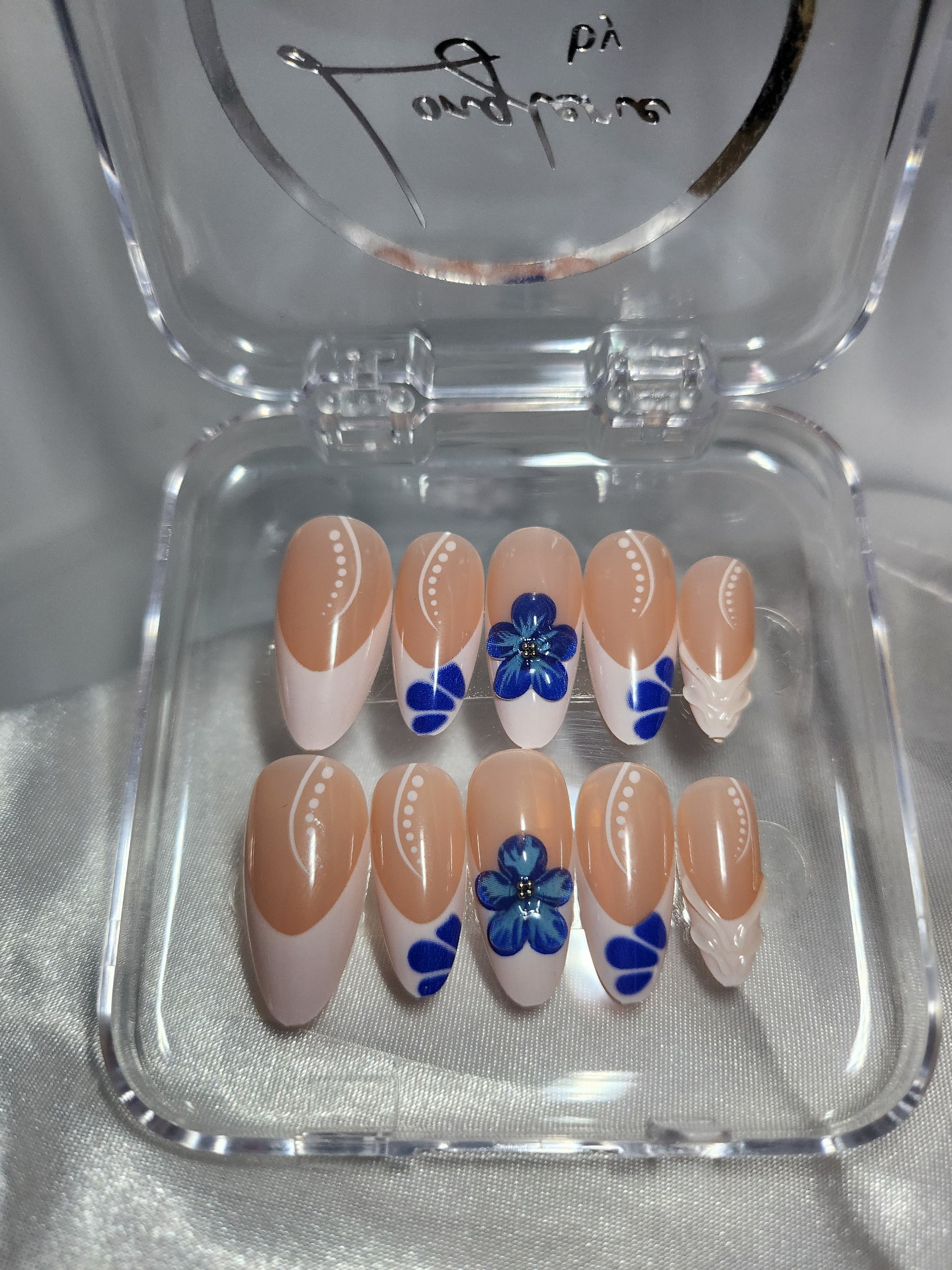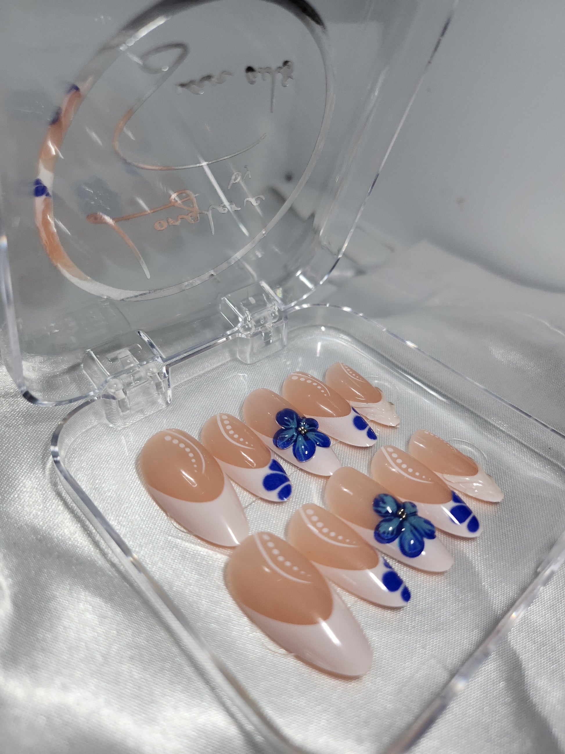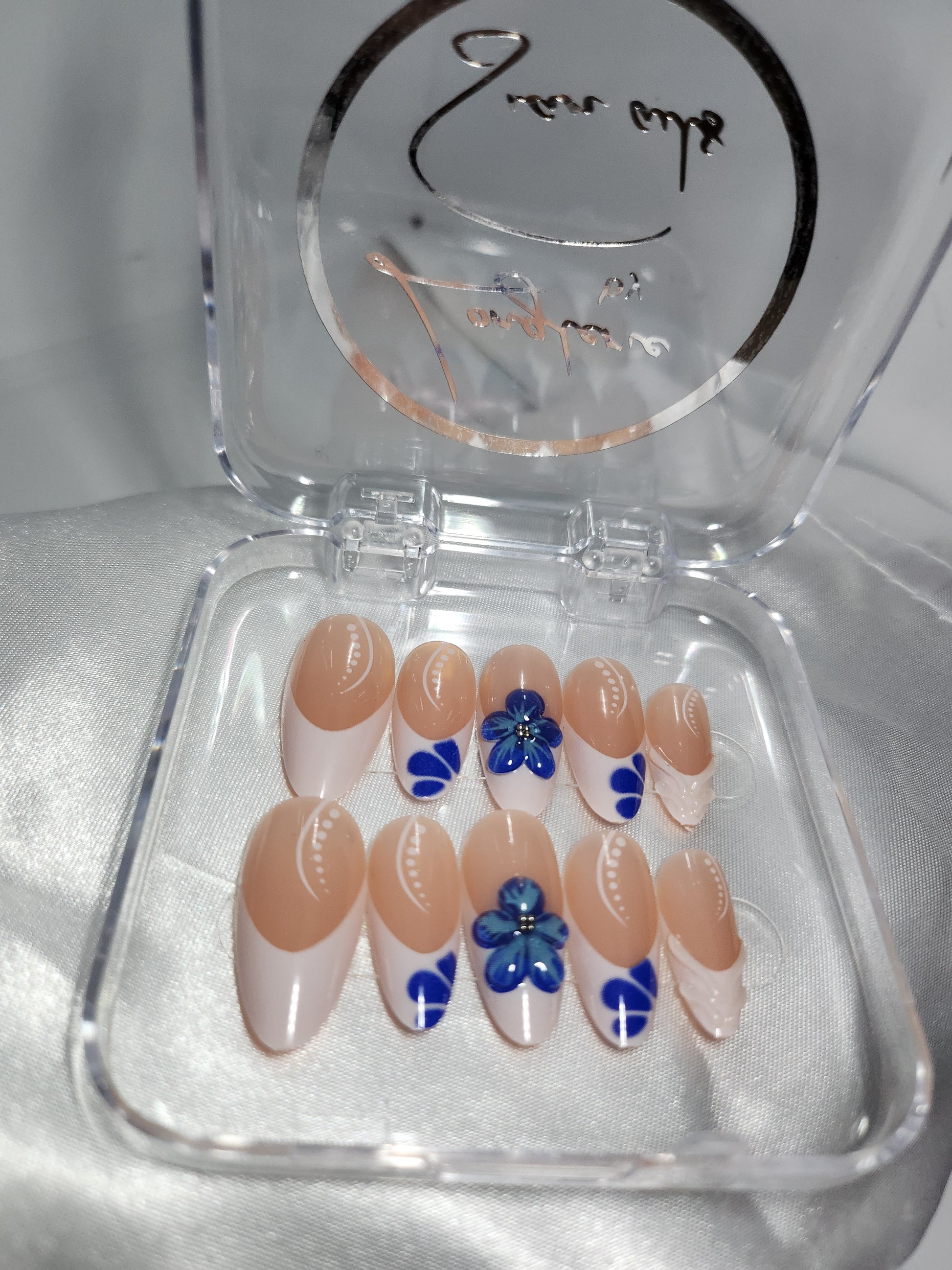 French blanche, fleurs bleues et forme amande pour un rendu doux et fĂ©minin.đžâšïž